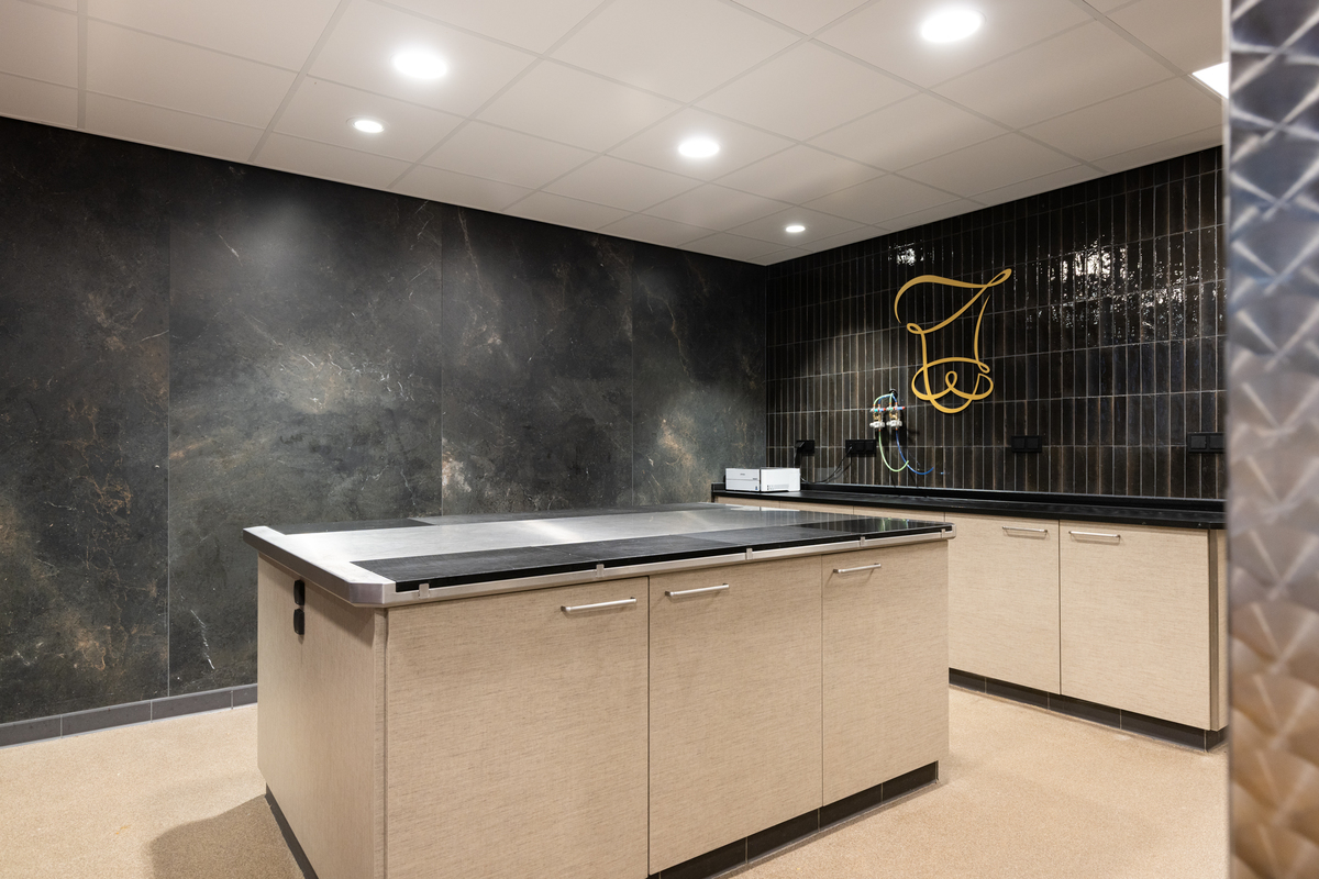 Achter de toonbank is de open werkruimte volledig zichtbaar. Dit versterkt het ambachtelijke karakter van de winkel en betrekt de klant actief bij het vakmanschap achter de producten. Transparantie en vertrouwen staan hier letterlijk in het zicht.